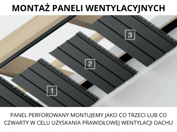 1. Ile paneli wentylowanych potrzebuję? Odpowiedź: Najczęściej stosowana zasada to montaż jednego panelu wentylowanego na każde 3 panele pełne. Taka proporcja zapewnia wystarczającą powierzchnię czynną wlotu powietrza, aby skutecznie przewietrzać połać dachową.