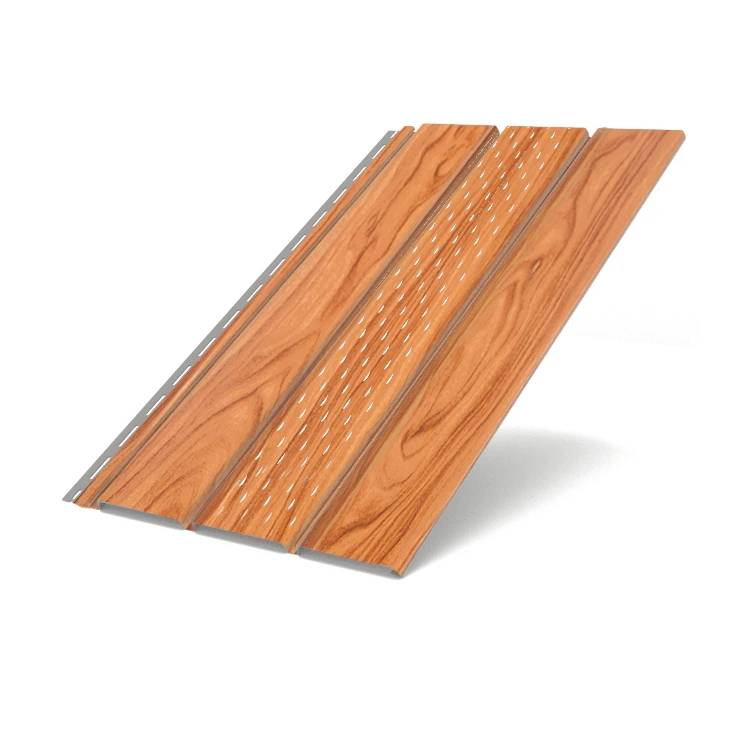 BRYZA orzech złoty - Podsufitka WENTYLACYJNA (trzydeskowa) / 30,5cm x 3m to perforowana podsufitka PVC z trzydeskowa, zaprojektowana do efektywnego wykończenia podbicia dachów w domach i budynkach gospodarczych, zapewniająca cyrkulację powietrza i zapobieganie skraplaniu wilgoci. Odporna na wilgoć, gwarantuje trwałość bez konserwacji, a ciepły odcień orzecha złotego imituje naturalne drewno, dodając elegancji i naturalnego uroku. Trzydeskowa konstrukcja ułatwia montaż i szybkie pokrycie dużej powierzchni. Odkryj harmonię stylu i funkcjonalności z podsufitką BRYZA!