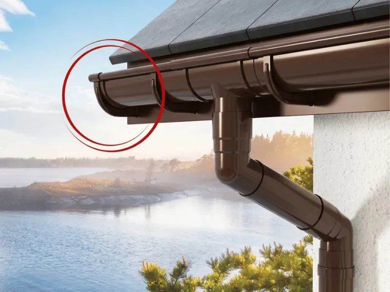 Płynne przejście rynny na rogach budynku. Narożnik zewnętrzny 90° marki Bryza (system 75 mm) w kolorze brązowym to element łączący dwa odcinki rynny na zewnętrznym kącie dachu.