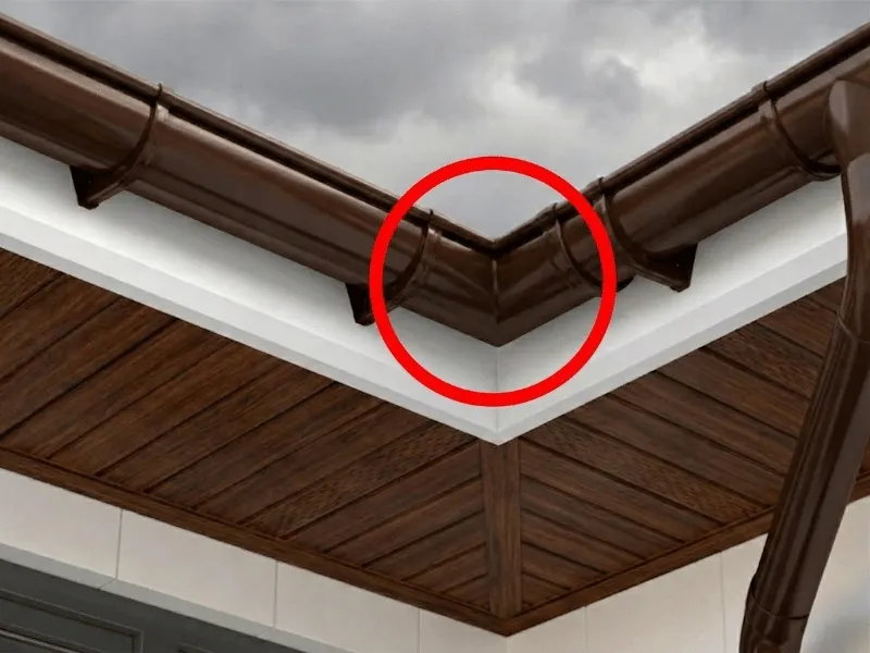 Płynne przejście rynny na rogach budynku. Narożnik zewnętrzny 90° marki Bryza (system 75 mm) w kolorze brązowym to element łączący dwa odcinki rynny na zewnętrznym kącie dachu.