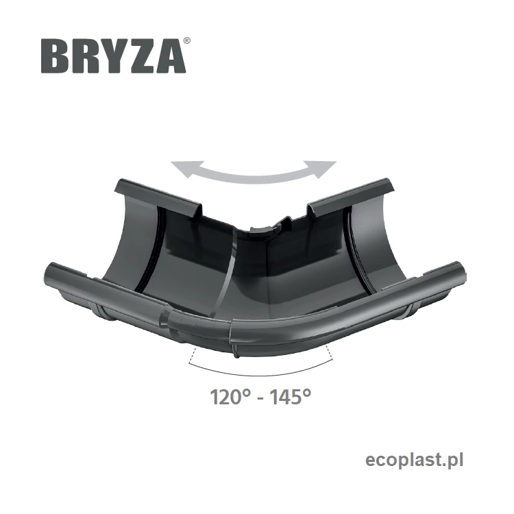 Innowacyjny, grafitowy narożnik wewnętrzny regulowany Bryza PVC o średnicy 125 mm to rozwiązanie stworzone z myślą o nietypowych bryłach budynków. Umożliwia precyzyjne dopasowanie linii rynnowej we wklęsłych załamaniach dachu o kącie od 120 do 145 stopni. Wykonany z trwałego tworzywa barwionego w masie, zapewnia całkowitą odporność na korozję, doskonałą wytrzymałość na warunki atmosferyczne oraz pełną wodoszczelność okapu na długie lata.