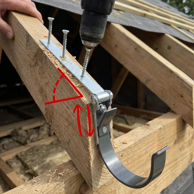Hak regulowany przykręcamy najczęściej od góry do krokwi (lub opcjonalnie do łaty). Najlepszą praktyką jest zamontowanie pierwszego (najwyższego) i ostatniego (najniższego) haka, precyzyjne ustawienie ich kątów i zablokowanie śrubą, a następnie rozciągnięcie między nimi sznurka dekarskiego. Dzięki temu błyskawicznie ustawisz kąt i wysokość pozostałych haków, zachowując idealny spadek w kierunku rury spustowej. Pamiętaj, aby przy pojemnym systemie 125 mm rozmieszczać haki w bezpiecznym, zagęszczonym rozstawie co 40-50 cm, zachowując spadek 2 mm na 1m , w kierunku leja spustowego