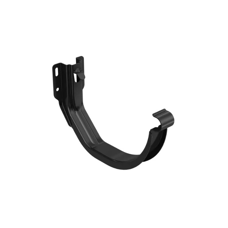 Uchwyt rynnowy doczołowy Bryza, stalowy, 120 mm, kolor czarny. Bardzo sztywny i odporny na korozję (ocynk + powłoka), zapewnia precyzyjne ustawienie spadku i pewne mocowanie rynny do deski czołowej. Kompatybilny z systemem Bryza 120.