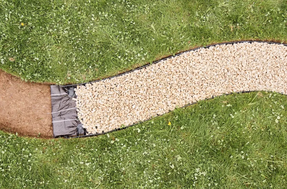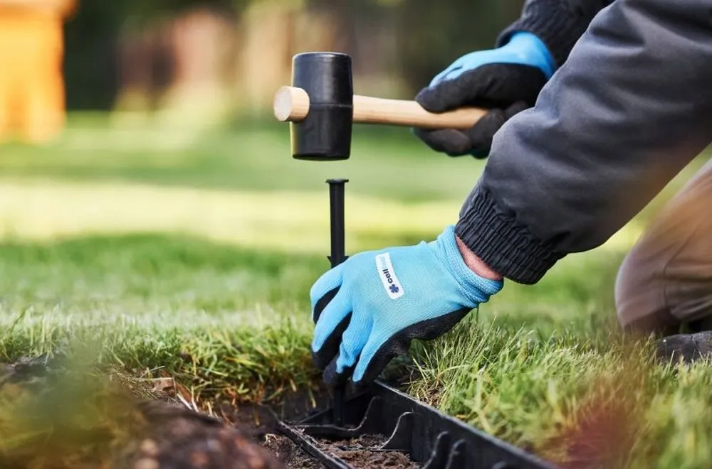 Montaż obrzeża jest prosty i nie wymaga specjalistycznych narzędzi. Wyznacz przebieg krawędzi, wykonaj płytkie nacięcie lub bruzdę w gruncie, a następnie osadź obrzeże na wymaganej głębokości. Odcinki łącz zgodnie z kształtem prowadzenia – w razie potrzeby dobij delikatnie gumowym młotkiem. Dla stabilizacji zastosuj kotwy/szpilki montażowe (zwykle co 30–50 cm, gęściej na łukach i przy zmianach kierunku); w zależności od zestawu szpilki mogą być sprzedawane oddzielnie. Po ustawieniu krawędzi dociśnij grunt po obu stronach i uzupełnij materiał (np. żwir, kora, kruszywo), dbając o to, aby nie przewyższał wysokości obrzeża. Prawidłowy montaż zapewnia trwałość linii i minimalizuje konieczność poprawek.