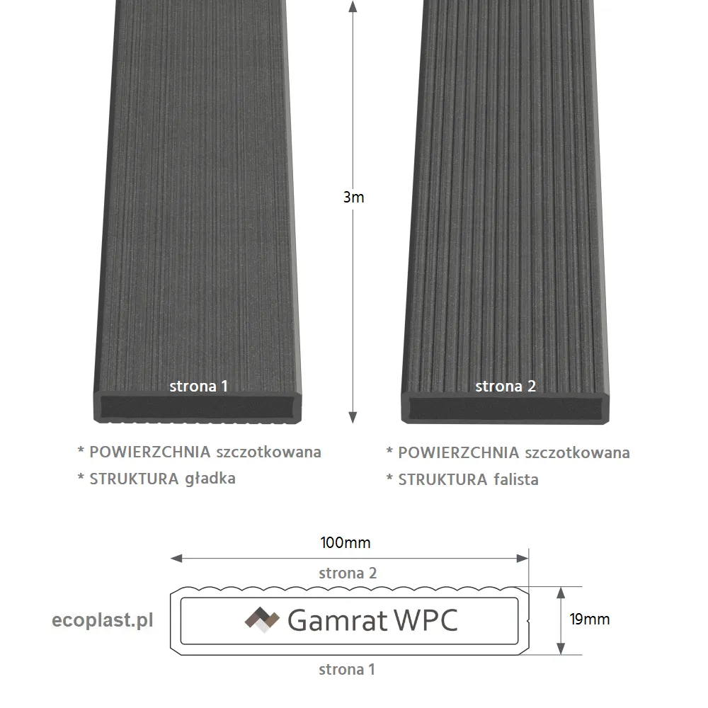 Uniwersalny profil WPC 100×19 mm (sztacheta) w kolorze grafit, długość 3 m. Do przęseł, balustrad, ekranów i zabudów tarasowych. Odporność na wilgoć i UV, niska konserwacja, łatwe docinanie.