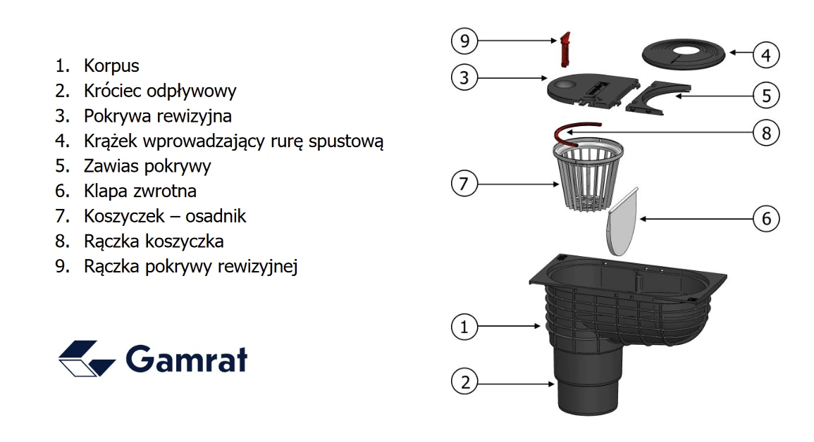 Montaż osadnika GAMRAT PVC jest prosty i nie wymaga specjalistycznych narzędzi. Korpus (1) jest dostosowany do rury wylotowej o średnicy 110 i 125mm. Przed zamontowaniem korpusu należy w pokrywie osadnika (4) przygotować odpowiedni otwór zgodnie z rozmiarem rury spustowej odprowadzającej wodę. Pokrywę należy położyć na równą podkładkę, tak aby wytłoczone oznaczenie średnic było widoczne. Następnie ostrym narzędziem, np. nóż do cięcia wykładzin podłogowych, należy wyciąć po zewnętrznej krawędzi oznaczenia żądany otwór. Następnie pokrywę założoną na korpus nasunąć na na wylot rury spustowej i cały element osadzić w rurze kanalizacyjnej z uszczelką. Po wypoziomowaniu zamontowanych elementów osadnika należy je zabetonować aż do górnej krawędzi korpusu. W czasie zabetonowywania należy założyć pokrywkę rewizyjną (3) oraz pokrywę osadnika (5) wraz z krążkiem pokrywy (4). Po wyschnięciu betonu osadzić koszyczek (7) a następnie wsunąć klapkę antyzapachową (6). Zobacz też beczki na deszczówkę w celu efektywniejszego odzyskiwania wody deszczowej.