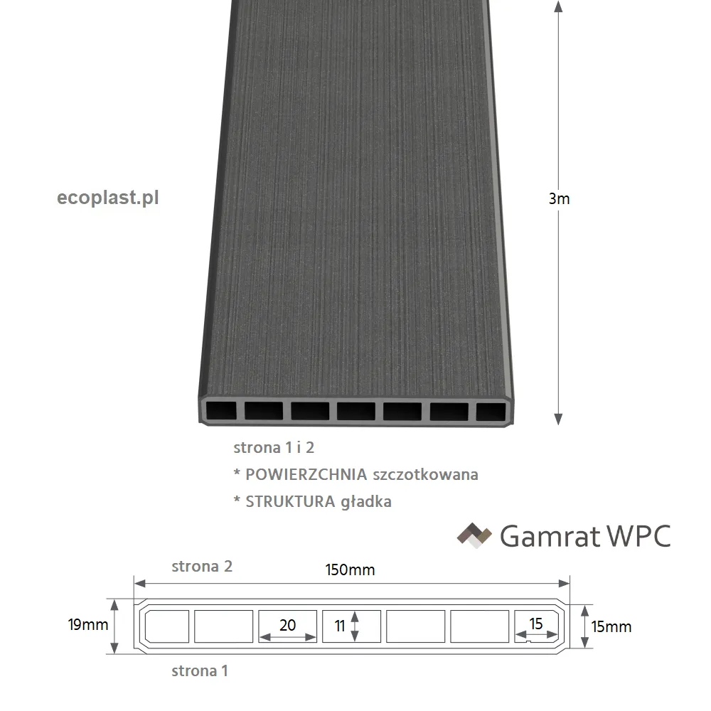 Wysokiej jakości deska kompozytowa (sztacheta) z serii GAMRAT WPC Classic w kolorze grafitowym. Deska o długości 3 metrów, przeznaczona do budowy nowoczesnych, bezobsługowych ogrodzeń o układzie poziomym.