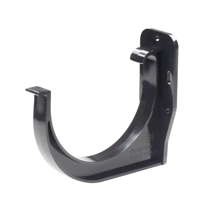 Uniwersalny uchwyt rynnowy doczołowy z PVC, kolor grafit, do rynien 75 mm. Montaż do deski czołowej, odporność na UV i warunki pogodowe, szybki i pewny montaż.