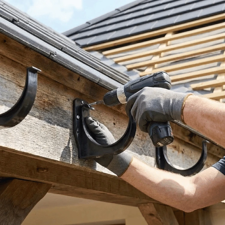 Uchwyt montuje się bezpośrednio do deski czołowej za pomocą odpowiednio dobranych wkrętów. Rozstaw uchwytów dobierz zwykle co 50–60 cm (gęściej przy narożach, łącznikach i w okolicy rur spustowych), aby rynna była równomiernie podparta na całej długości. Przed przykręceniem wyznacz linię spadku — rekomendowany spadek roboczy to ok. 2–3 mm na każdy metr bieżący rynny (zgodnie z wytycznymi danego systemu). Pierwszy i ostatni uchwyt ustaw w odniesieniu do założonego spadku, następnie rozciągnij sznurek/żyłkę i zamocuj uchwyty pośrednie. Pamiętaj, aby nie dokręcać elementów „na siłę” i pozostawić rynnie możliwość pracy termicznej. Po montażu sprawdź stabilność oraz drożność odpływu do rury spustowej, wykonując próbę wodą.