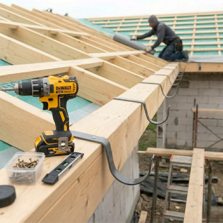 Montaż haków prostych odbywa się bezpośrednio na krokwiach przed ułożeniem właściwego pokrycia dachowego. Aby system działał bezawaryjnie, należy zachować odpowiedni spadek rynny (ok. 2-3 mm na metr bieżący). Do profilowania płaskownika zalecamy użycie profesjonalnej giętarki dekarskiej. Ze względu na specyfikę II gatunku i podwójną warstwę farby, w miejscach gięcia mogą pojawić się dodatkowe pęknięcia powłoki, które warto zabezpieczyć farbą zaprawkową, aby chronić stal przed czynnikami zewnętrznymi.