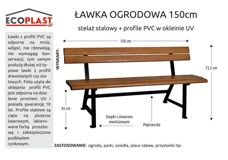 Ławka z desek PVC 150cm to połączenie nowoczesnego designu i praktyczności. Jej jakość i trwałość sprawiają, że jest to mebel na lata, a prostota montażu – z otworami w nogach do przymocowania do podłoża – ułatwia instalację. Stwórz swoją idealną przestrzeń w ogrodzie – sprawdź ławki i deski ławkowe PVC.
