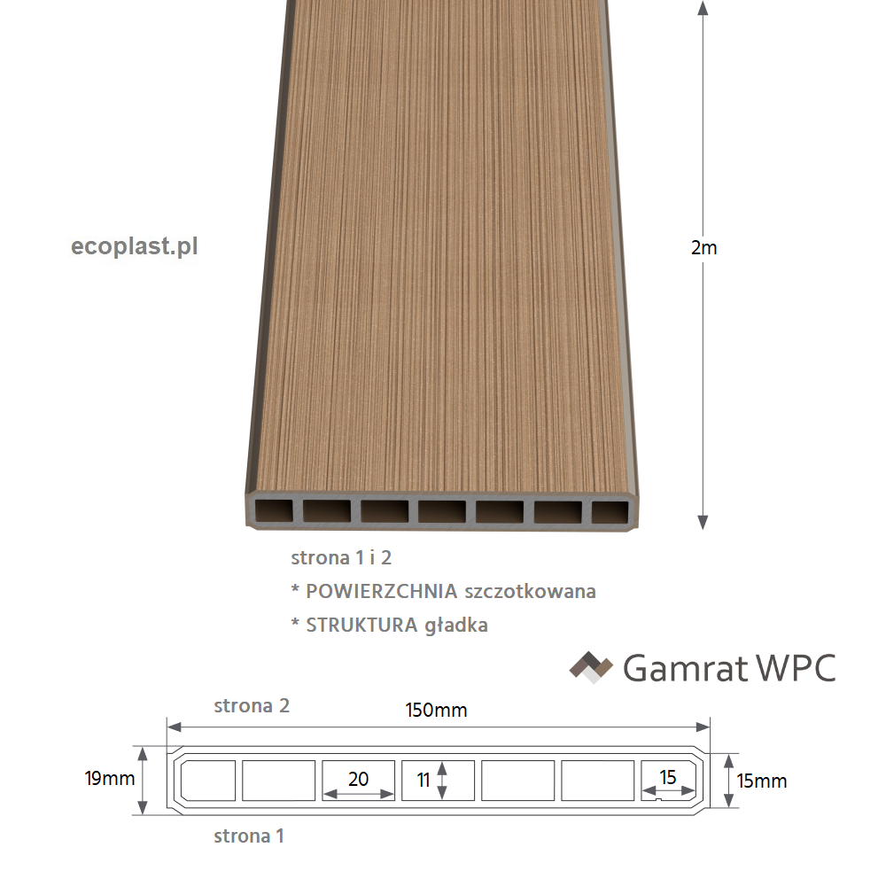 Sztachety kompozytowe (WPC) renomowanej marki GAMRAT o profilu 150x19mm zostały zaprojektowane z myślą o dopasowaniu, kontraście i współdziałaniu z innymi elementami zewnętrznymi domu. Technologia panelu kompozytowego sprawia iż deska jest mocna, nie ulega rozpadowi, korozji i co najważniejsze nie potrzebuje konserwacji oraz malowania.