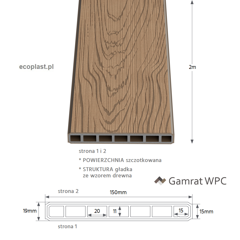 Sztachety kompozytowe (WPC) renomowanej marki GAMRAT o profilu 150x19mm zostały zaprojektowane z myślą o dopasowaniu, kontraście i współdziałaniu z innymi elementami zewnętrznymi domu. Technologia panelu kompozytowego sprawia iż deska jest mocna, nie ulega rozpadowi i korozji, nie rozłupuje się i co najważniejsze nie potrzebuje konserwacji/malowania.