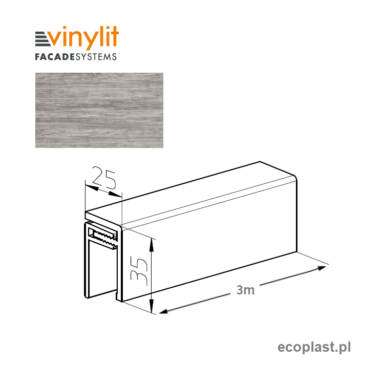 Rozpocznij montaż swojej elewacji w surowym, industrialnym stylu. Dedykowana listwa startowa "J" w unikalnym kolorze Sheffield Oak Concrete to profesjonalny fundament dla systemów fasadowych VINYLIT. Gwarantuje idealnie prosty start, prawidłową wentylację i estetyczny wygląd dolnej krawędzi, tworząc spójną całość z panelami w tym samym, odważnym dekorze.