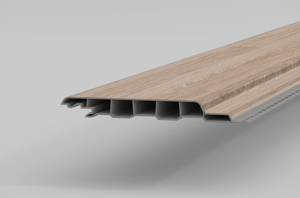 Deski elewacyjne z kolekcji vinyPlus Round Profile charakteryzują się szerokim POJEDYNCZYM profilem PŁASKIEJ deski. Powierzchnia laminowana jest najwyższej jakości okleiną UV o teksturze drewnopodobnej w kolorze Artisan Oak.