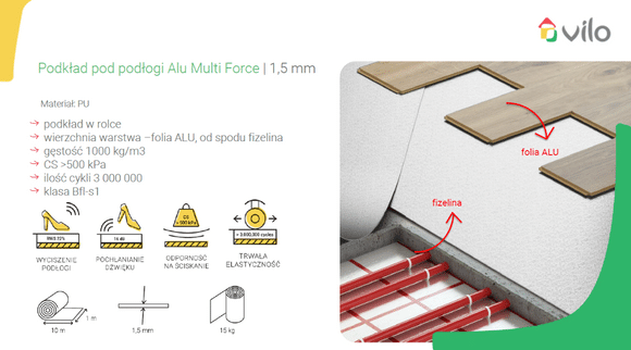 Podkład pod panele laminowane/winylowe Vilo Alu Multi Force 1,5mm składa się z dwóch warstw, warstwa wierzchnia - folia ALU, od spodu fizelina. To produkt o bardzo dużej gęstości 1000kg/m3 i dobrych parametrach akustycznych.