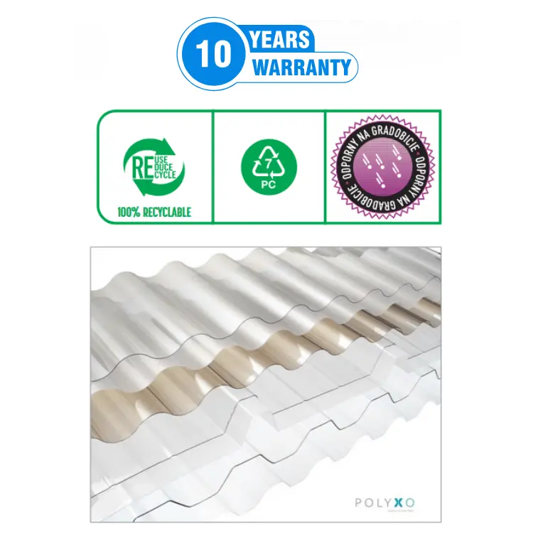 Produkt odporny na uderzenia kulek gradu o średnicy 20 mm i prędkości uderzenia 21 m/s. Pękanie arkuszy z powodu gradu oznacza, że arkusz ma kilka otworów na całym arkuszu w sposób regularny i rozłożony.