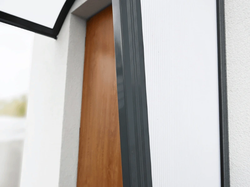 Daszek nad drzwi Robelit łukowy 158×75×38 cm – konstrukcja aluminiowa w kolorze antracyt + płyta z poliwęglanu mlecznego z filtrem UV. Lekki, wytrzymały, chroni wejście przed deszczem i śniegiem; szybki montaż nad drzwiami, witryną lub wyjściem na taras.
