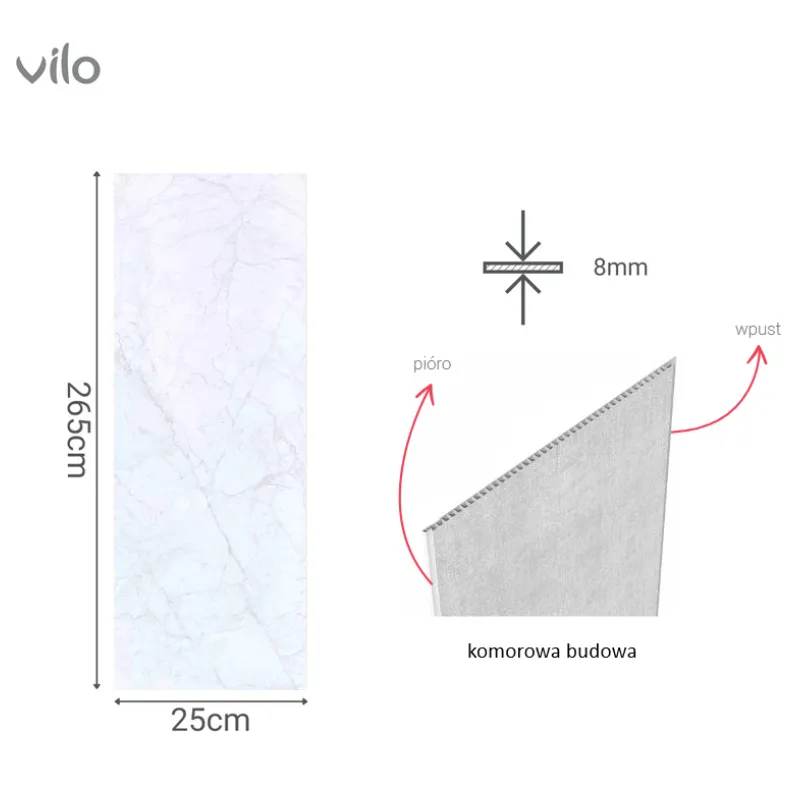 Decydując się na panel Vilo Motivo Cararra Marble, stawiasz na połączenie nowoczesnego designu i praktycznych właściwości. Panel PVC 25cm x 2,65m od Vilo doda Twoim wnętrzom klasycznego charakteru, jednocześnie optycznie powiększając przestrzeń. Jego wodoodporność i brak fug gwarantują higieniczne i trwałe wykończenie, idealne do wymagających pomieszczeń. Łatwy montaż na klej pozwala na szybką instalację bez dodatkowych kosztów. Panele Vilo to to wysoka jakość i szeroki wybór – sprawdź listwy i akcesoria oraz panele dekoracyjne.