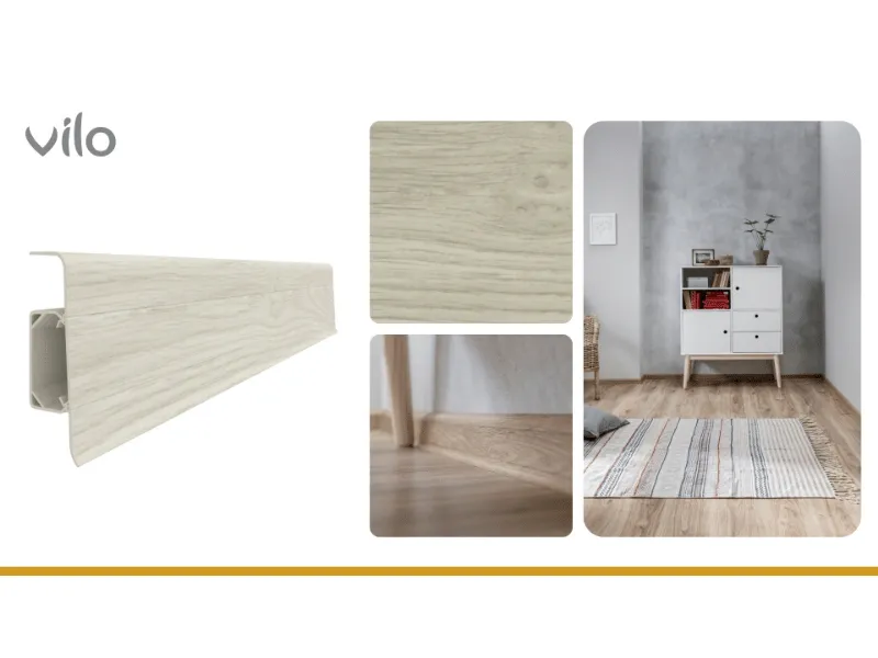 Listwa przypodłogowa Vilo ESQUERO w kolorze Platan Arizoński (602) to połączenie naturalnego uroku drewna z nowoczesną, geometryczną formą. Prosty profil o wysokości 6,6 cm doskonale wykańcza podłogę, a konstrukcja z PVC gwarantuje 100% wodoodporność. Posiada praktyczny system ukrywania kabli.