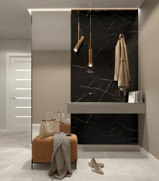 1. Do jakiego stylu pasuje Calacatta Black? Odpowiedź: Ten wzór jest stworzony do stylu Glamour, Art Deco oraz nowoczesnego minimalizmu w wersji premium. Pięknie komponuje się ze złotymi dodatkami, szkłem, lustrami oraz jasną podłogą, tworząc silny, elegancki kontrast.