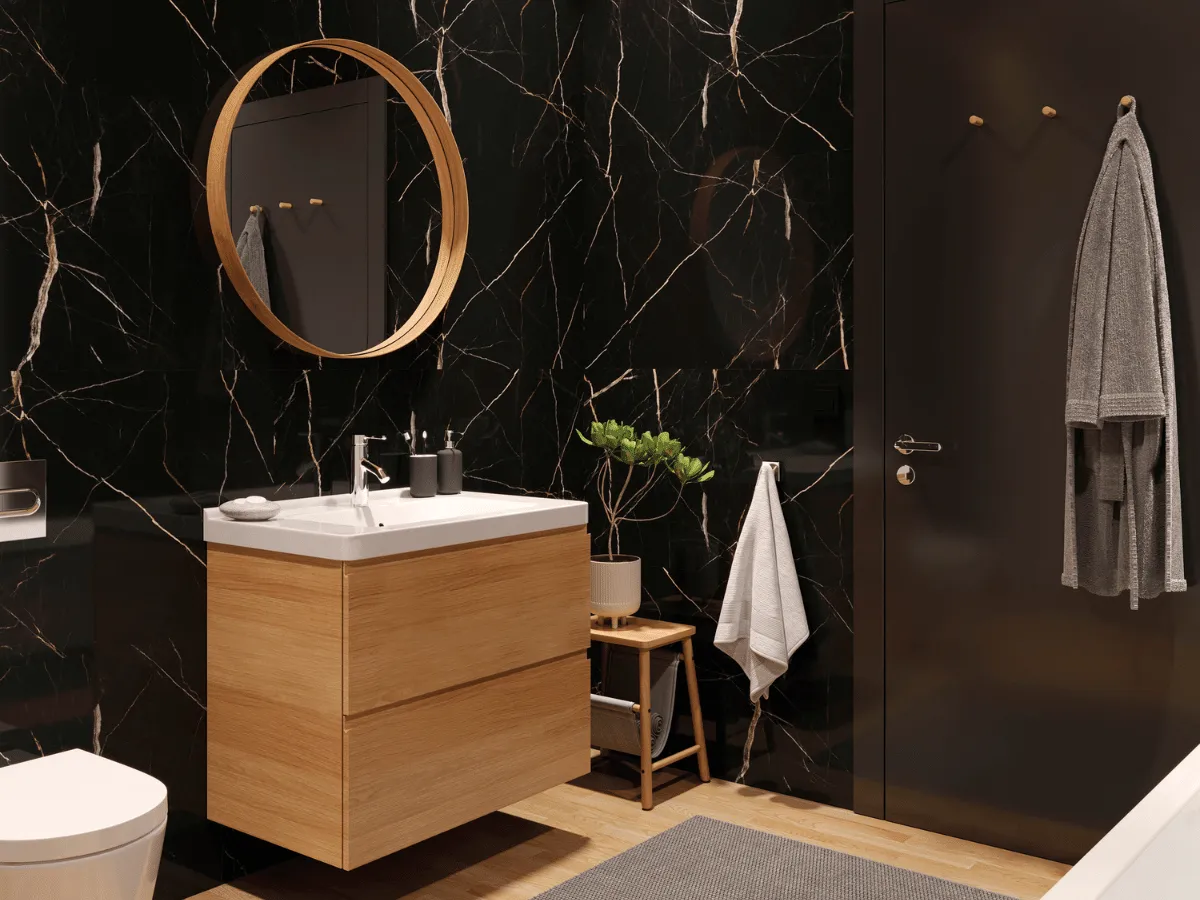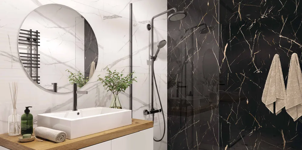 Nowoczesny panel ścienny z kompozytu SPC w dekorze Calacatta Black. Odporny na wilgoć, szybki w montażu, idealny do kuchni i łazienek (poza bezpośrednią strefą natrysku, jeśli producent nie stanowi inaczej).