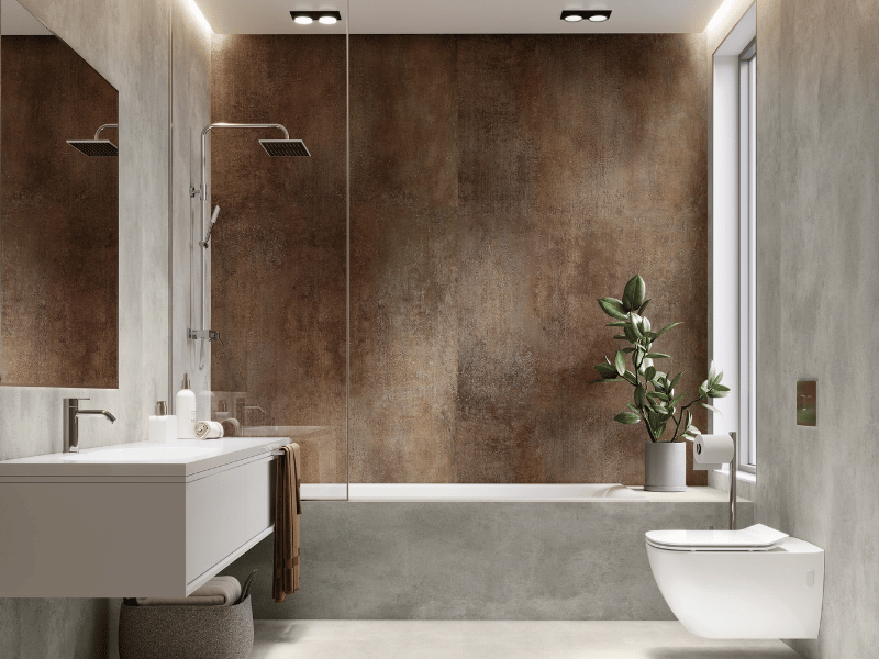 Rewolucja w remoncie łazienki. Wodoodporny panel ścienny SPC marki Vilo o wymiarach 30x60 cm w industrialnym wzorze Rusty.