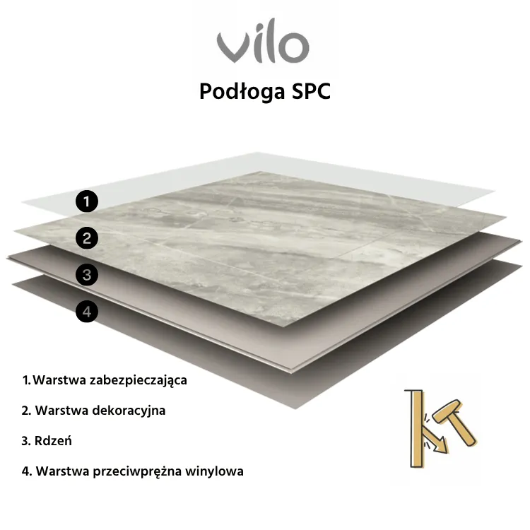 Vilo - Panele winylowe SPC Marble Skin Klasa 33 5mm / 60cm x 60cm (mat) to podłoga o wyjątkowej, organicznej strukturze kamienia. Dzięki 4 solidnym warstwom i sztywnemu rdzeniowi SPC jest niezniszczalna w domowych warunkach i gotowa na wyzwania komercyjne (Klasa 33). Wodoodporna, cicha i idealna na "podłogówkę".