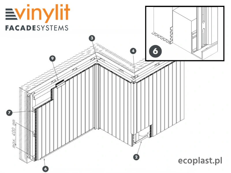 Każdy detal w systemie VINYLIT ma swoje zadanie, a otwory drenażowe w listwie startowej są tego najlepszym przykładem. Zostały one precyzyjnie rozmieszczone, aby stworzyć wydajny kanał odpływowy dla kondensatu. To przemyślane rozwiązanie inżynieryjne, które gwarantuje długowieczność całej ściany.
