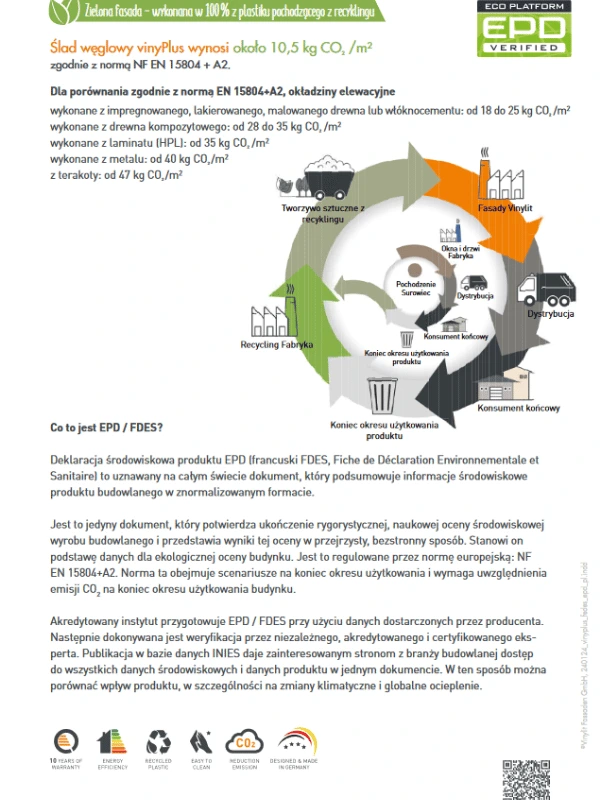 Inwestycja w Vinylit to wybór niemieckiej solidności. Produkt jest w 100% odporny na korozję biologiczną i trudne warunki pogodowe. Producent dba również o zrównoważony rozwój – panele powstają z wykorzystaniem surowców wtórnych i są w pełni zdatne do recyklingu. To rozwiązanie, które łączy piękną estetykę z dbałością o środowisko. Aby kompleksowo wykończyć dach, sprawdź również inne dostępne w naszym sklepie podsufitki dachowe. Oferujemy bogatą paletę barw – od klasycznej bieli i grafitu, po dekory drewnopodobne, które idealnie dopasujesz do swojej nowej elewacji.