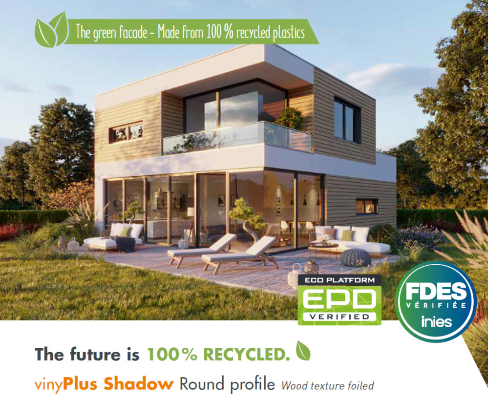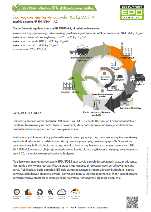 Profile pokryte są odporną na promieniowanie UV folią strukturalną, wykonane są w 100% z tworzyw sztucznych pochodzących z recyclingu i są zweryfikowane pod kątem EPD / FDES co oznacza iż mają niezwykle niewielki ślad węglowy w porównaniu np. z impregnowanym drewnem czy metalowymi fasadami.