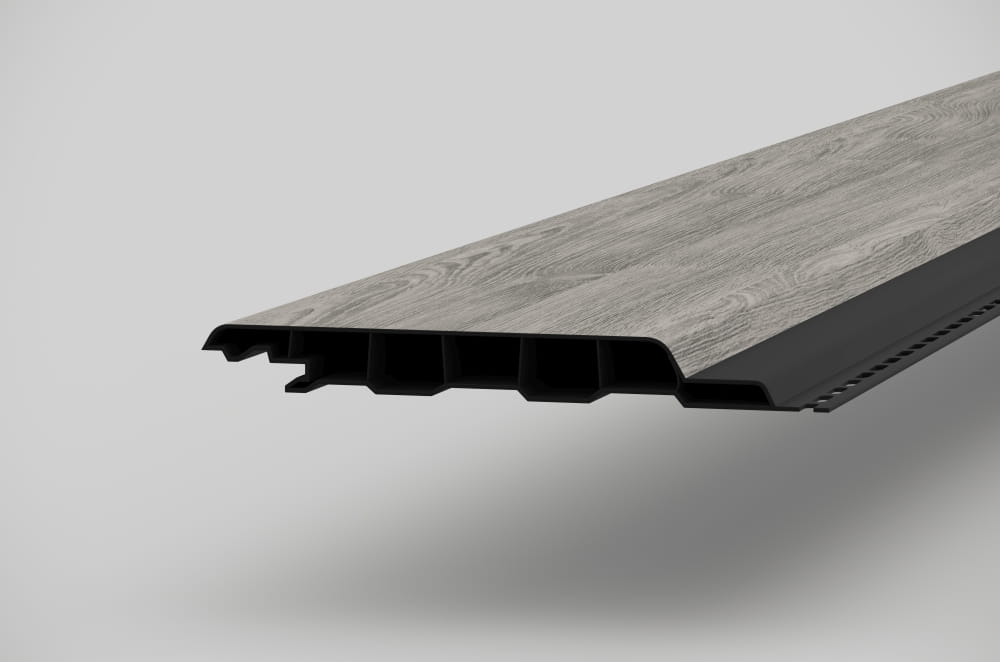 Komorowa budowa profilu deski sprawia iż jest ona wyjątkowa mocna i stabilna; montaż w systemie PIÓRO-WPUST jest prosty i szybki, deski przykręcamy do konstrukcji za pomocą wkrętów w układzie do wyboru PIONOWY lub POZIOMYM; max długość profili wynosi aż do 6m.