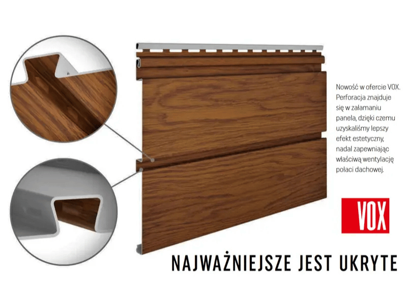 Tradycyjne podbitki dachowe często wymagają wplatania widocznych paneli perforowanych, co potrafi zaburzyć minimalistyczny wygląd nowoczesnego okapu. W przypadku czarnej podsufitki VOX Infratop SV-09 zastosowano zupełnie inne, rewolucyjne podejście. System ukrytej wentylacji opiera się na precyzyjnie wyprofilowanych szczelinach, które zostały sprytnie zintegrowane w samych łączeniach paneli. Taka konstrukcja gwarantuje ciągłą, wydajną cyrkulację powietrza, skutecznie odprowadzając wilgoć i chroniąc drewnianą więźbę przed pleśnią czy przegrzaniem. Co najważniejsze, z perspektywy osoby patrzącej na budynek z dołu, cała powierzchnia podsufitki pozostaje idealnie gładka, jednolita i pozbawiona jakichkolwiek widocznych otworów. To inżynieryjny majstersztyk, który dba o kondycję dachu, jednocześnie perfekcyjnie eksponując głęboką, elegancką czerń wykończenia.