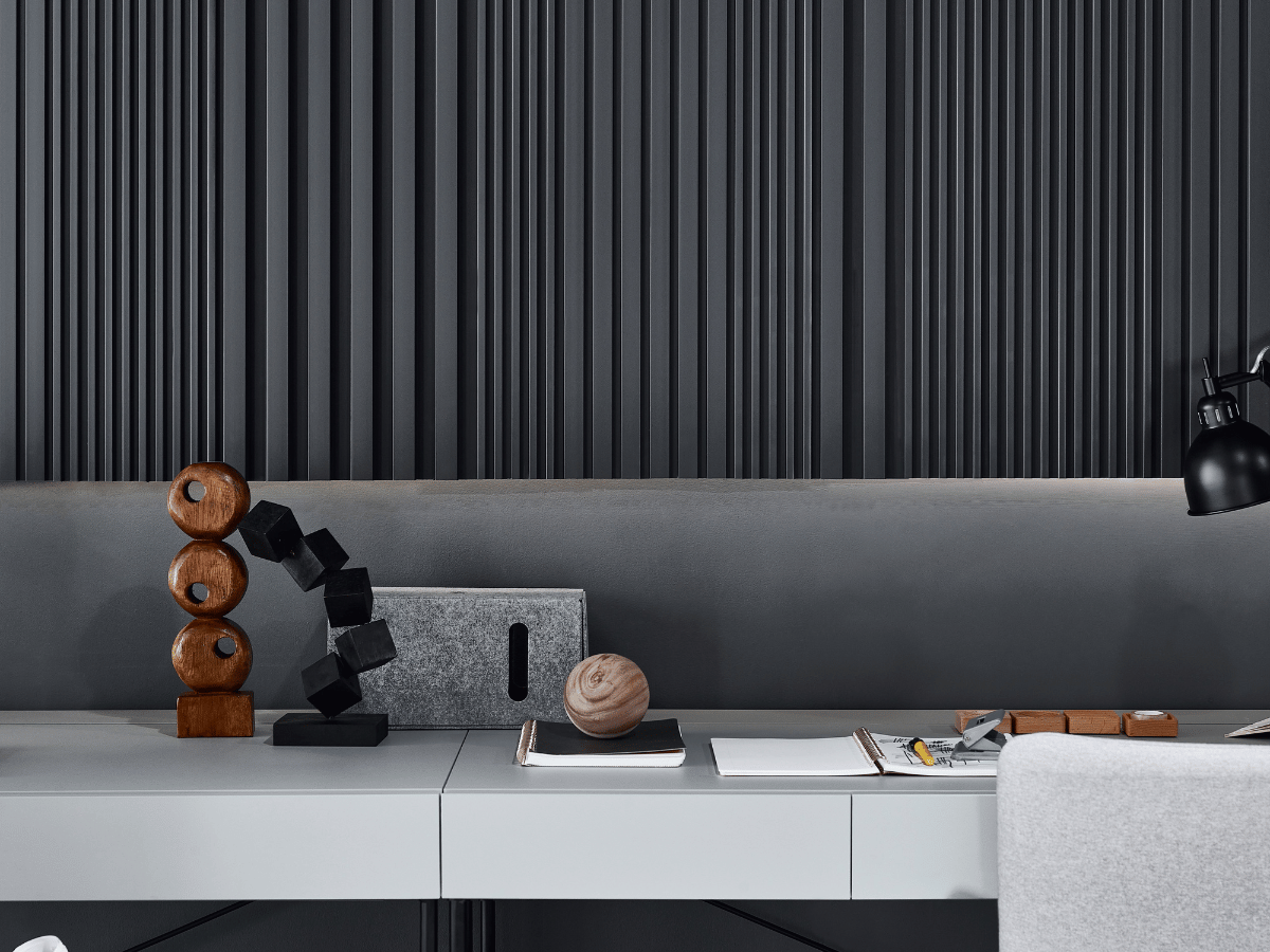 Głęboki antracyt doskonale komponuje się z innymi elementami wystroju. Stwórz mocny kontrast, łącząc go z panelami Linerio S-Line White, lub uzyskaj spójny, stonowany efekt z kolorem Linerio M-Line Grey. Antracyt pięknie współgra również z ciepłem drewna, co możesz osiągnąć, zestawiając go z lamelami Linerio S-Line Natural lub Linerio S-Line Mocca. Pamiętaj, że możesz także eksperymentować z szerokością lameli, wybierając panele z serii S-Line lub L-Line.