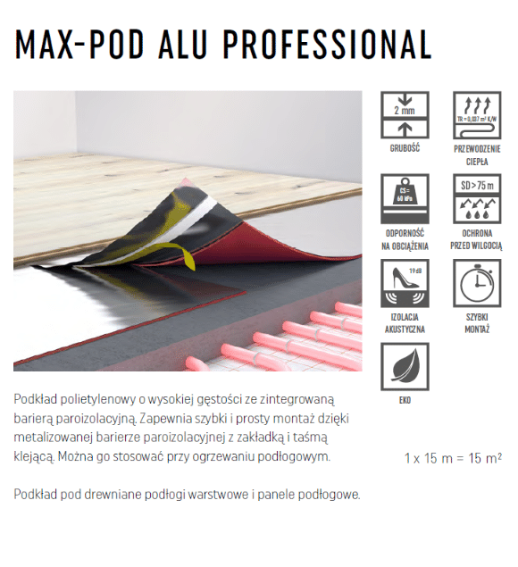 Profesjonalny podkład wyciszający. Podkład VOX Max-Pod Alu Professional o grubości 2 mm to idealny wybór pod panele laminowane, szczególnie na ogrzewanie podłogowe.