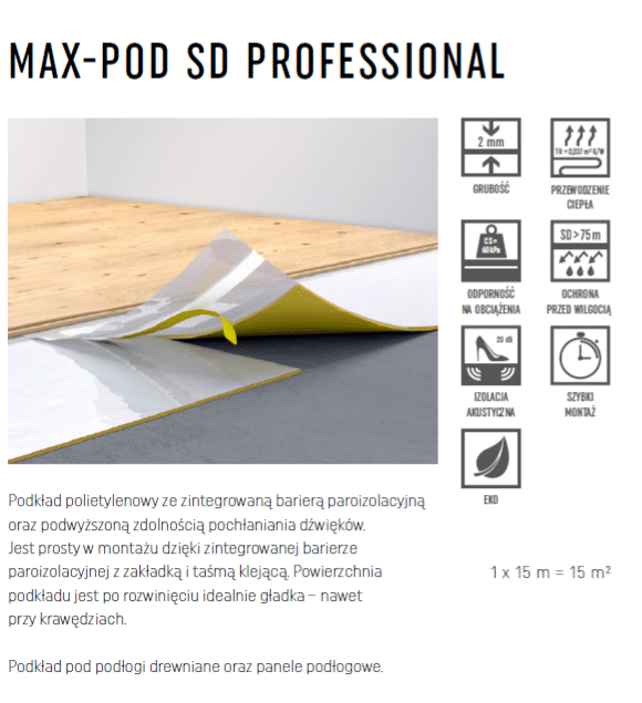1. Czy potrzebuję dodatkowej folii pod ten podkład? Odpowiedź: Nie! To największa zaleta tego produktu. Podkład ma zintegrowaną folię paraizolacyjną (SD). Wystarczy rozwinąć rolkę i skleić pasy za pomocą fabrycznej zakładki z taśmą samoprzylepną, aby uzyskać szczelną ochronę.